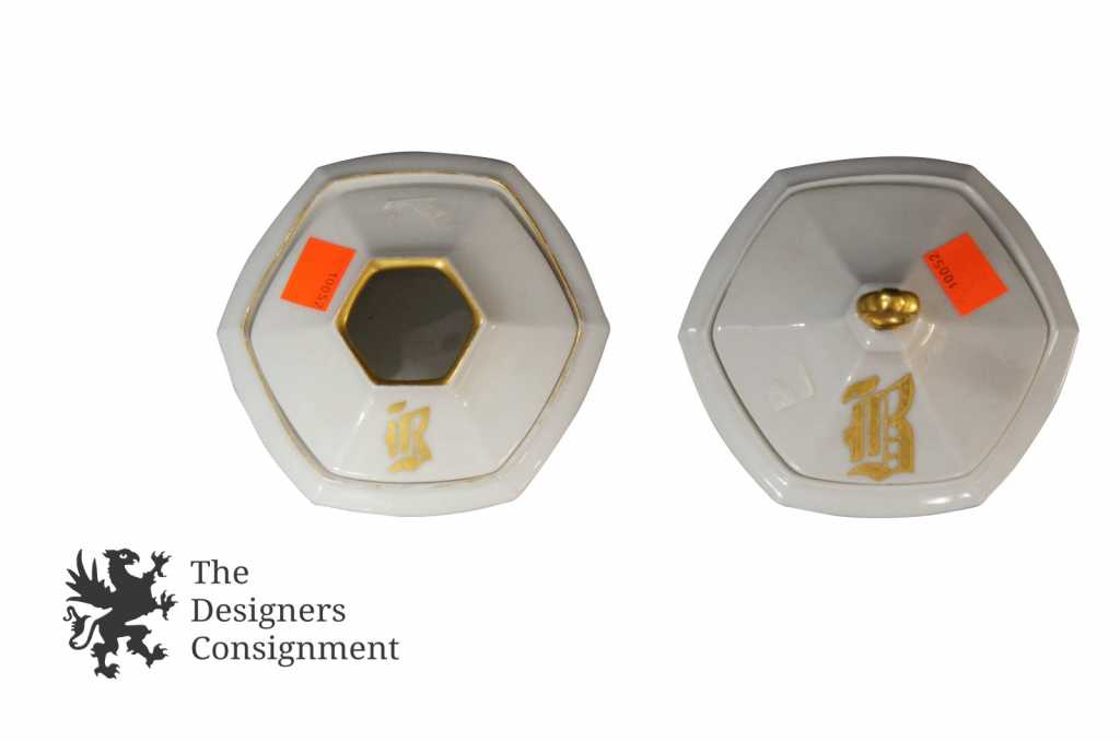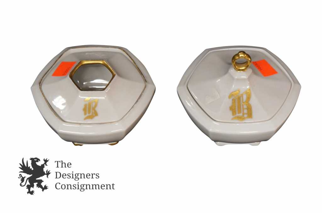 These are great pieces from the German porcelain manufacturer Moritz Zdekauer. They are a hair receiver and a powder jar that have a 1891-1917 mark on them as well as the name Harris written on them. They are decorated with a gold trim and a letter "B" monogram on them. These are gorgeous pieces and they would make wonderful additions to your home or collection.