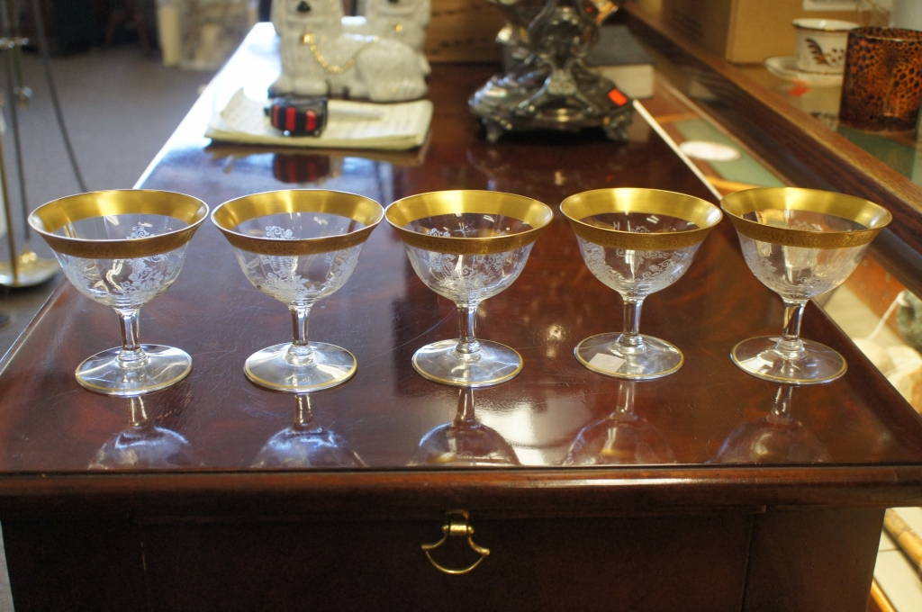5 Tiffin Etched Low Sherbert Glasses Gold Trimmed Mouth & Stem Cordial Crystal