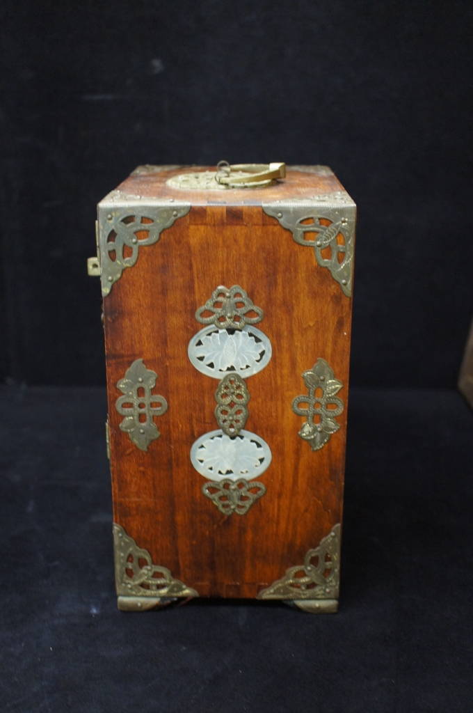 Vintage Antique Asian Chinese Oriental Wooden Jade Brass Handled Jewelry Box