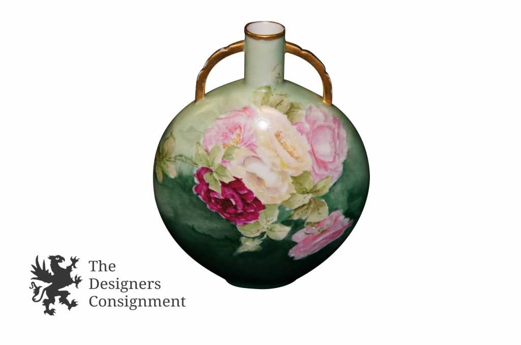 This is a gorgeous piece from the French porcelain maker Haviland France. It is a canteen vase that is decorated with floral designs and it features gold trim handles to it. The piece has the 1894-1931 green "Haviland France" mark. This is a truly beautiful piece and it would make a wonderful addition to your home or collection.