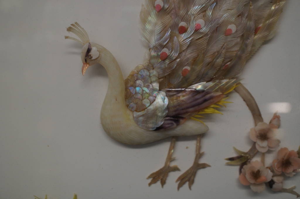 Stunning Asian Oriental 3D Shell Plastic Floral Peacock Bird Art w/ Frame