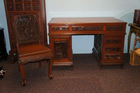 Beautifully Carved Asian Knee Hole Oriental Teak Office Desk & Chair Mid Century