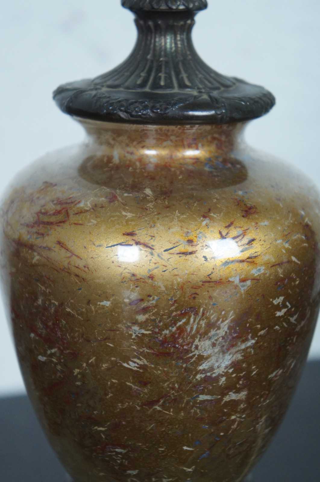 Antique slag glass table lamp. Features a golden reverse painted urn body and flower shaped, Tiffany style amber slag glass shade.