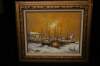 Vintage Oil Painting Boats in the Harbor in Winter Gold Painted Frame De Marco