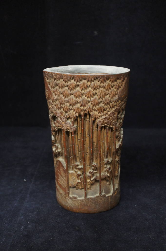 Decorative Collectible Handcarved Asian Oriental Monastery Scene Bamboo Vase