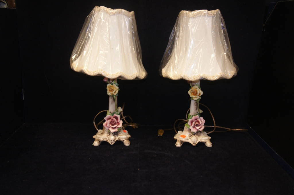2 Vintage Capodimonte Porcelain Table Lamps Rose Floral Majolica Marked Shades