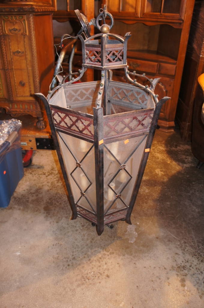 Vintage Wrought Iron Chandelier Light Fixture Glass Shade Hexagon Gothic Revival