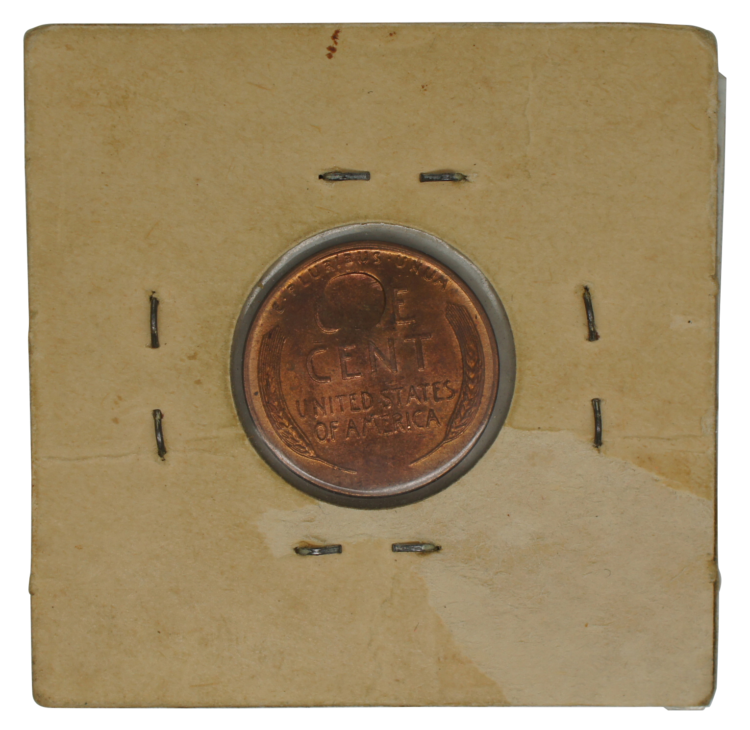 One United States of America 1954 one cent wheat penny with an added Masonic symbol stamped into Lincolns bust.