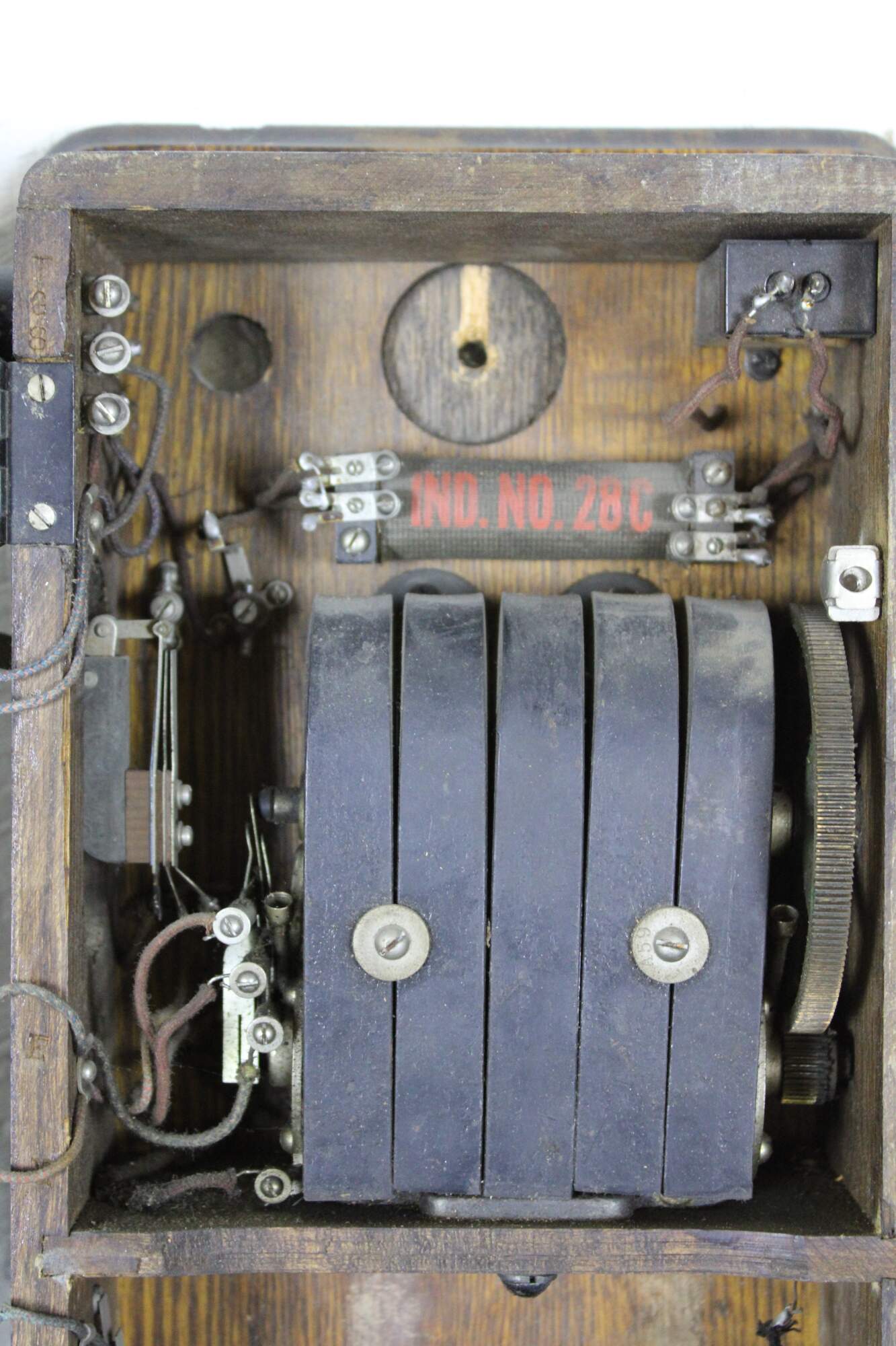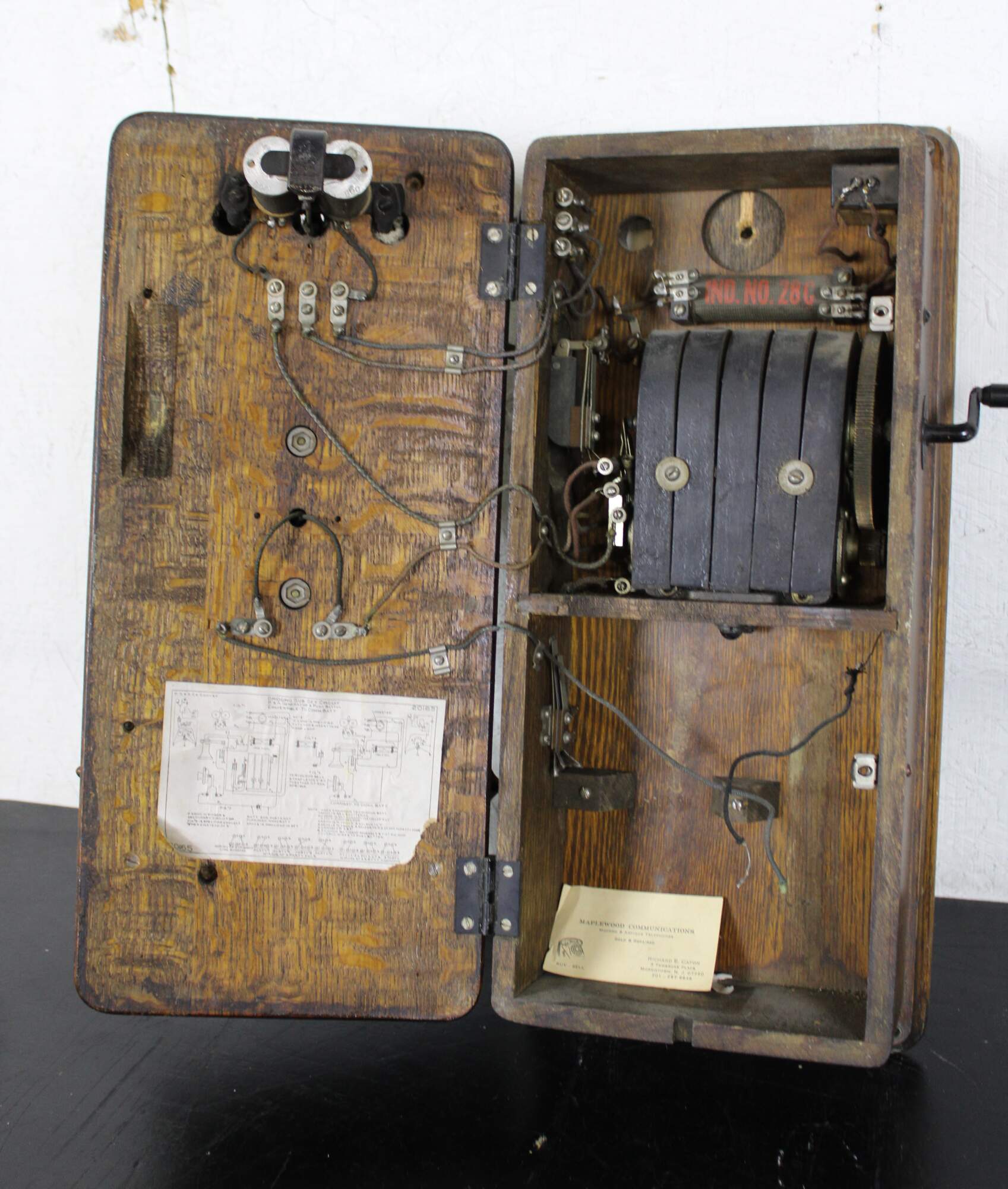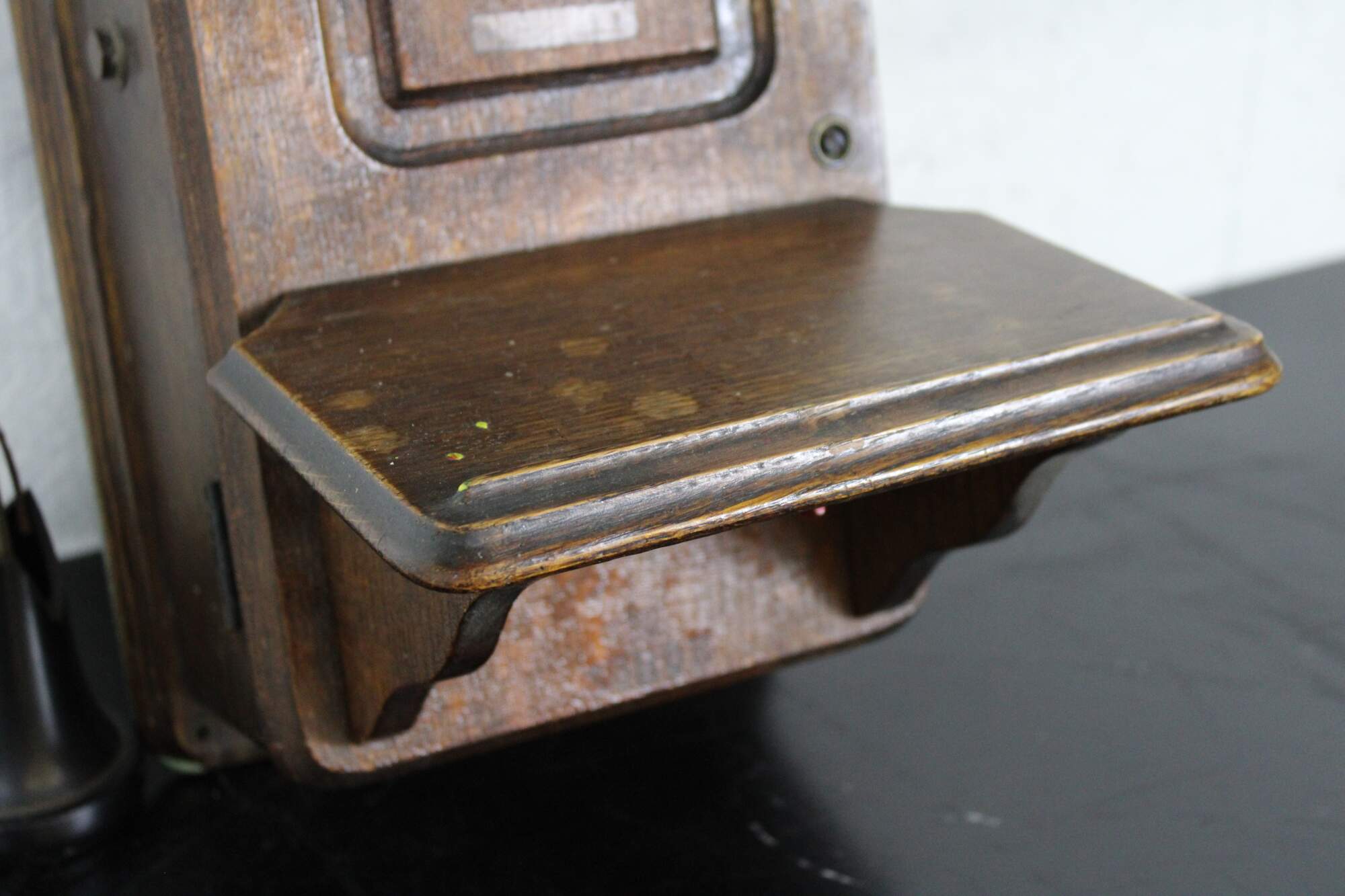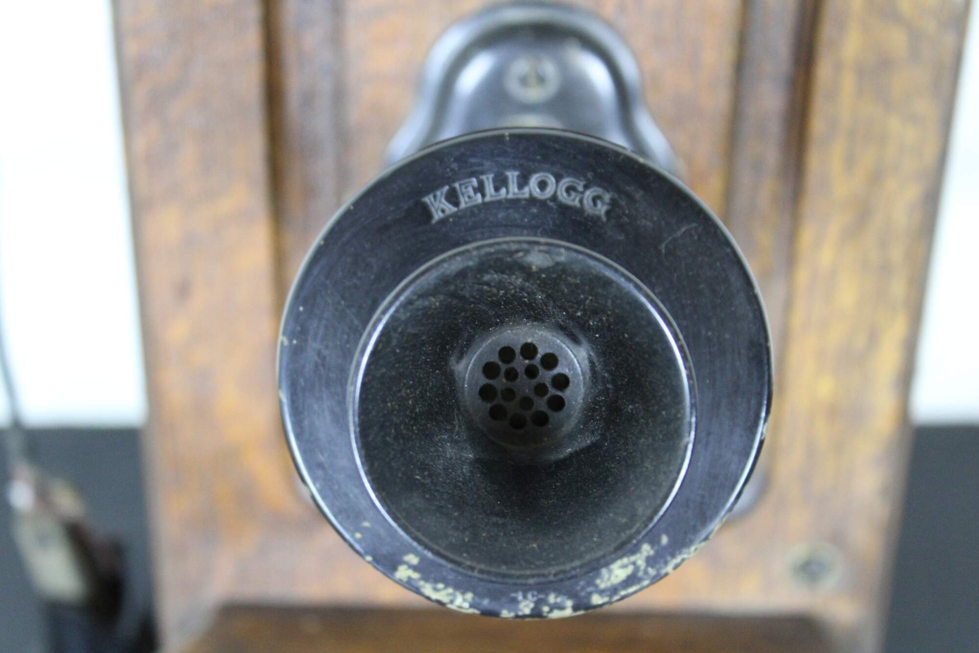 Antique early 1900s quartersawn tiger oak wall mounted telephone by the Kellogg Switchboard and Supply Company.