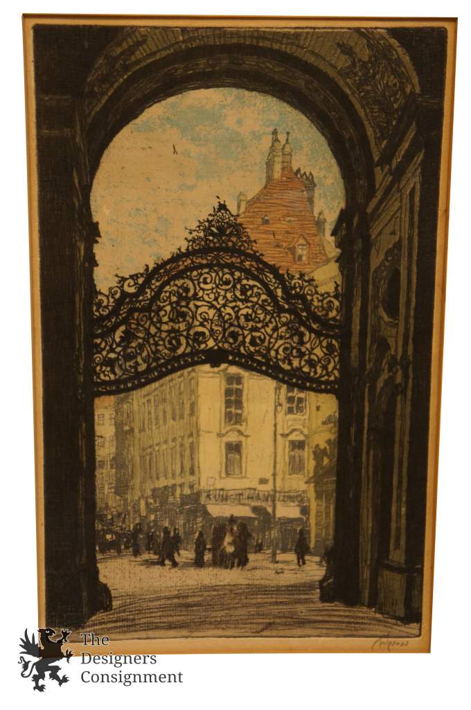 A lovely hand colored etching of the gate to Hofburg Palace in Vienna. This piece is signed. An absolutely beautiful piece and it would make a wonderful addition to your home or collection. Very similar to theMichaeler Tor etchings by Hans Figura and Luigi Kasimir