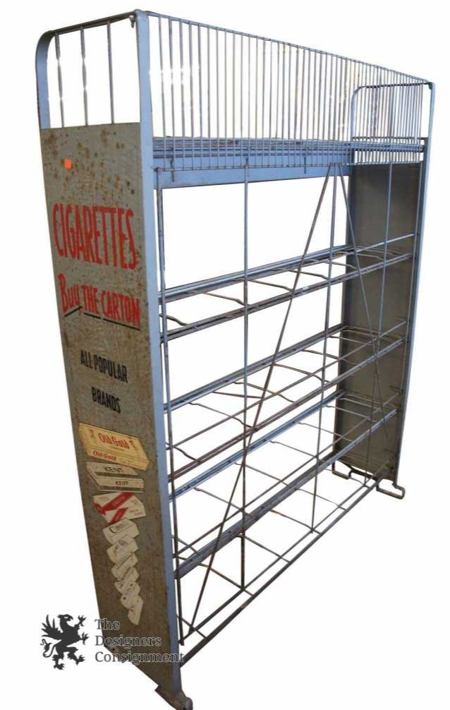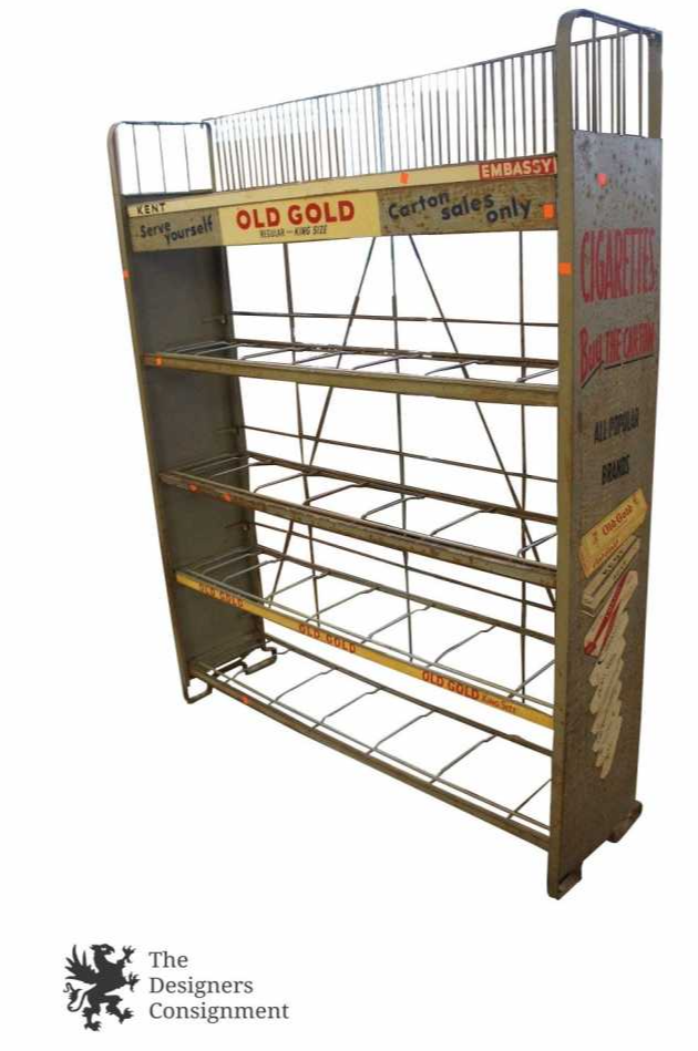 This is a gorgeous piece of vintage cigarette advertising. It is a carton self service display rack and it has Old Gold, Kent, Embassy, Camel, Lucky Strikes, Chesterfield, Philip Morris, Pall Mall designs on it. This is an absolutely beautiful piece and it would make a wonderful addition to your home or collection.