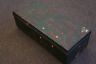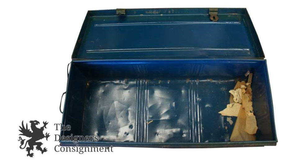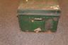 Here is a vintage footlocker. Green with red lettered top. Handles on both sides and flaps on the front for locking. This bin has a boat shaped bottom making it a little bit different then the others out there.
