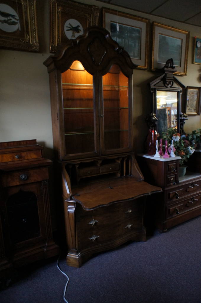 Karges Walnut Burl Wood Secretary Desk & Hutch Serpentine China Cabinet Bookcase