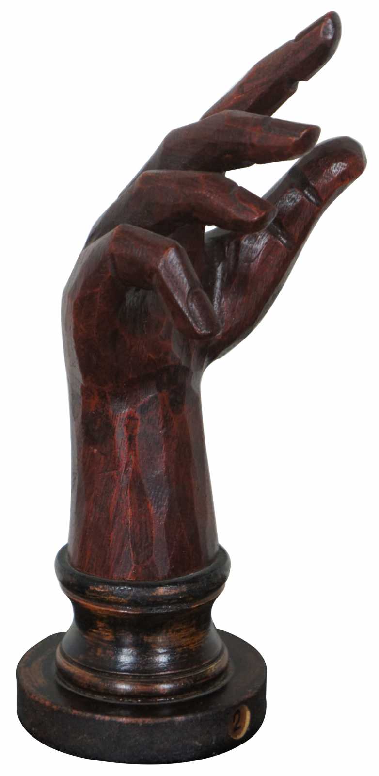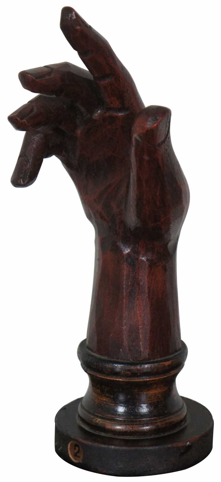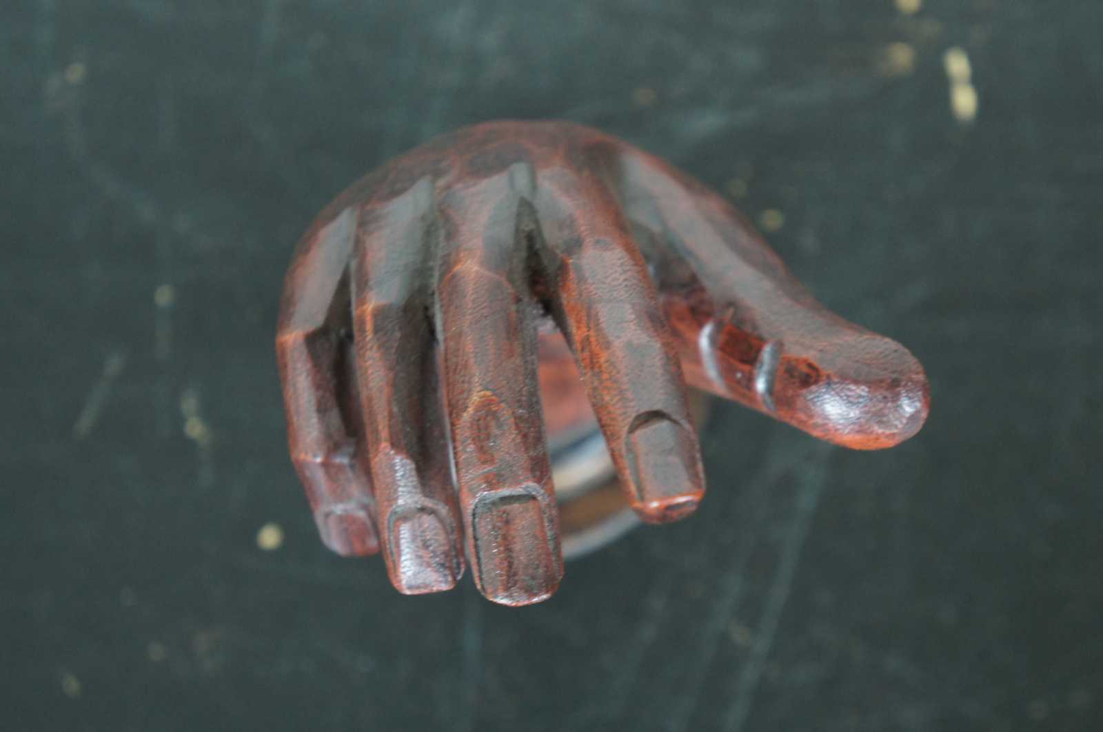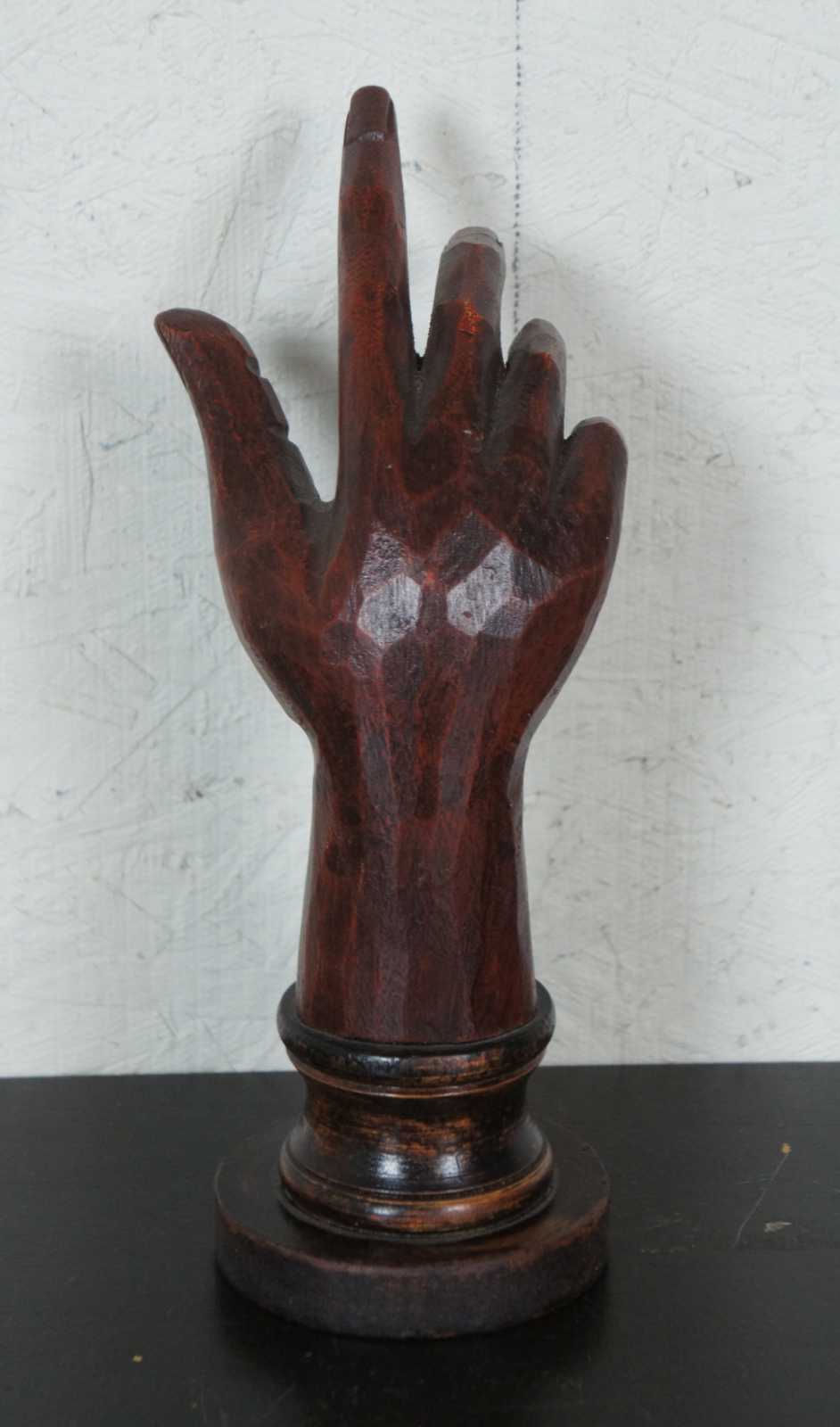 Vintage carved wood art sculpture in the shape of a right hand and forearm on a pedestal base labeled 2, made by Homart.