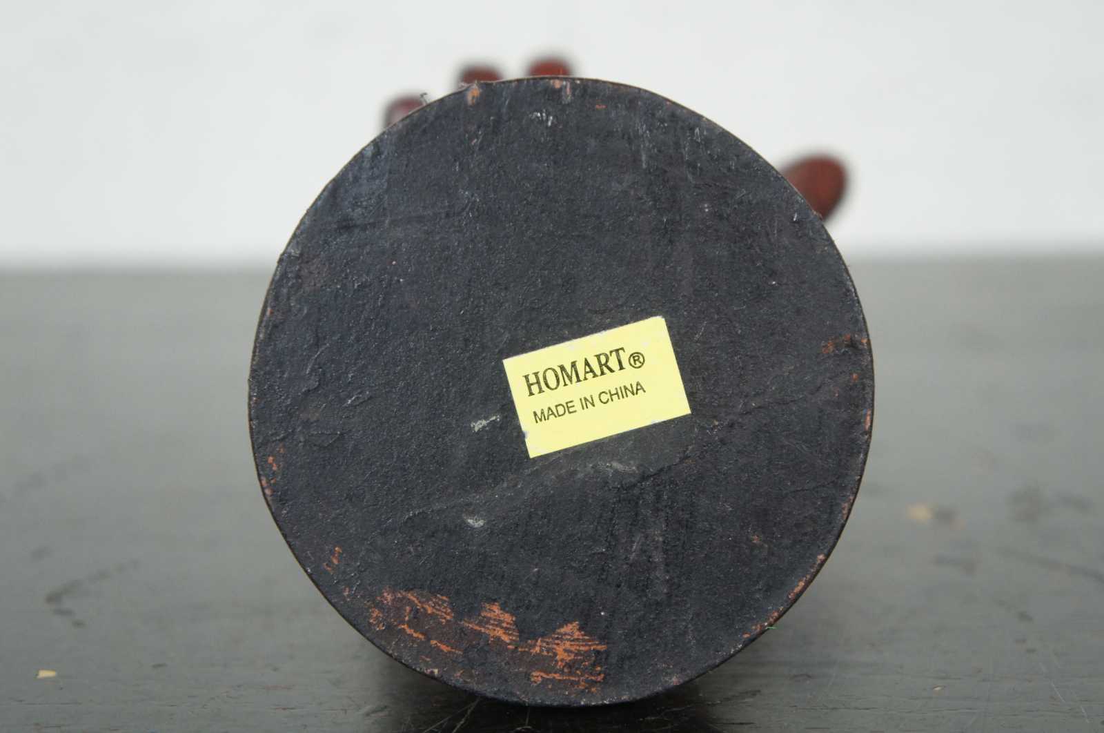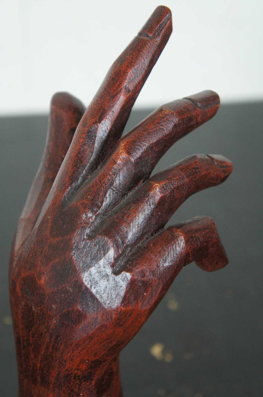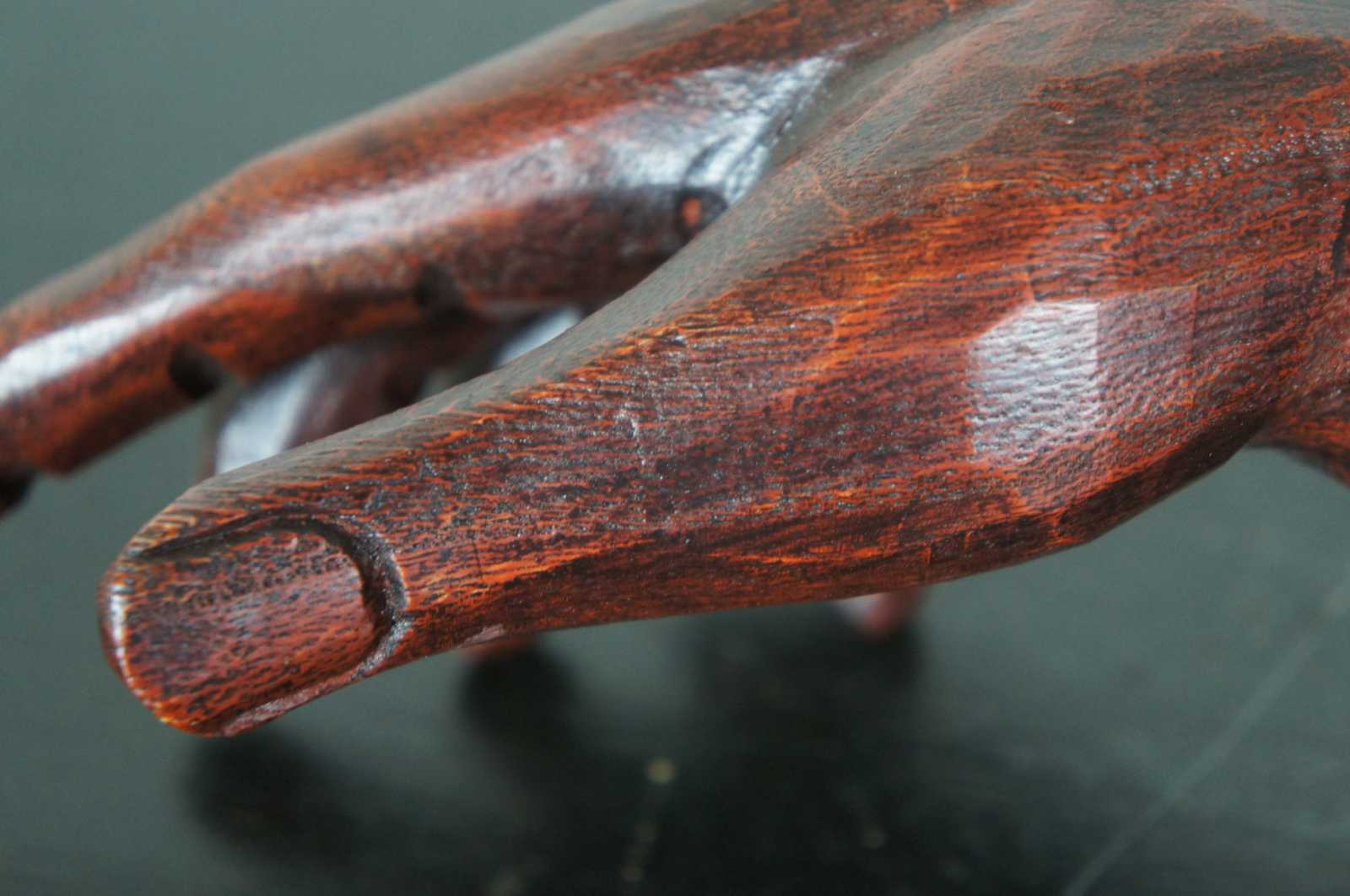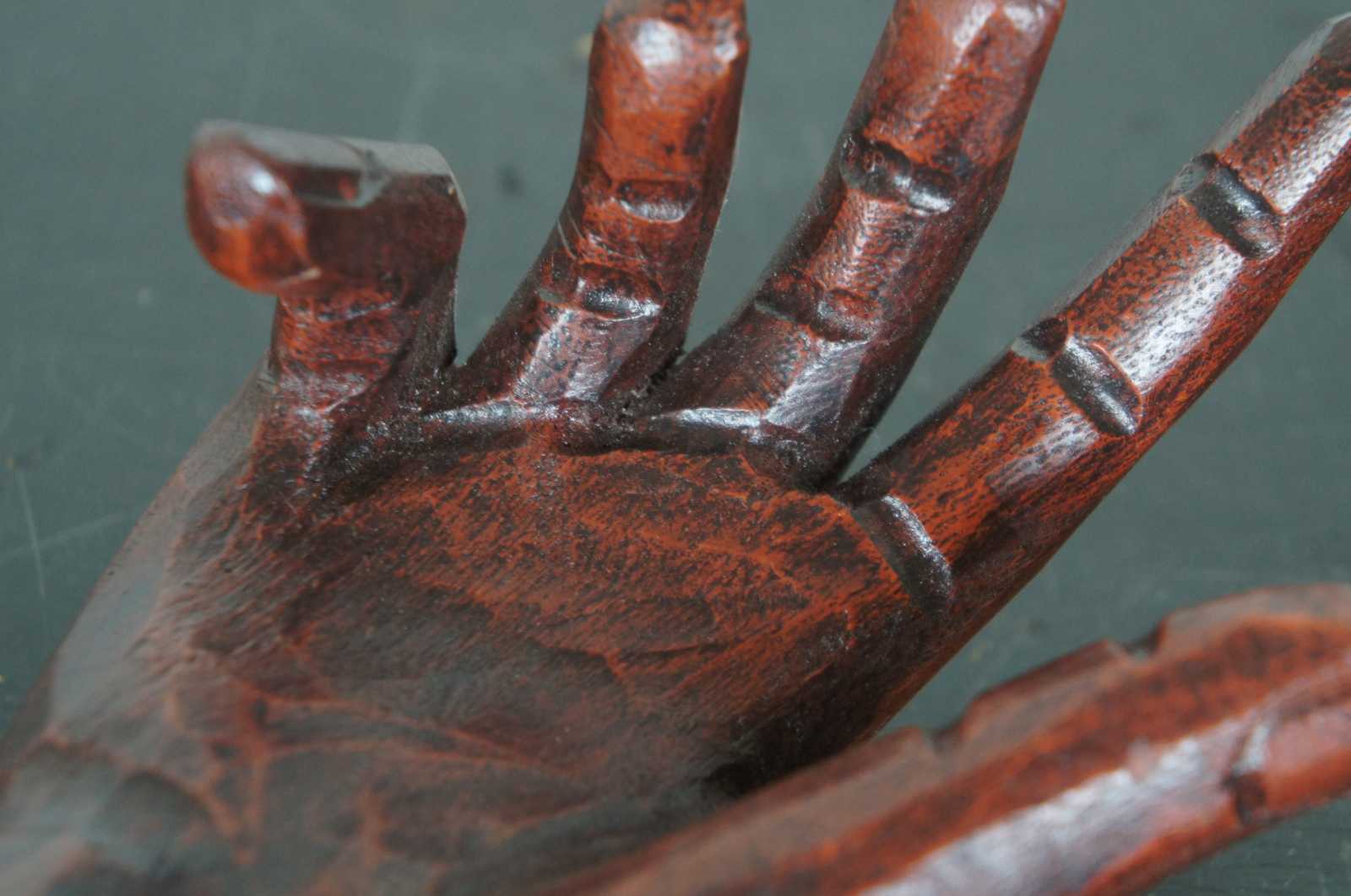Vintage carved wood art sculpture in the shape of a right hand and forearm on a pedestal base labeled 2, made by Homart.