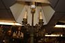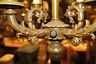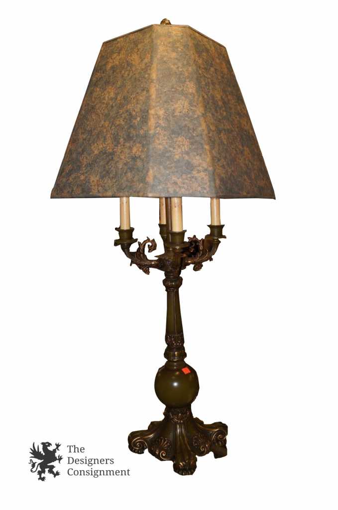 Here is lovely table lamp. Baroque revival with a Torchiere/ candelabra style top. 4 lights around the outside centered by a bigger light towards the top. This lamp has green and gold accents as well as figural faces towards the bottom of each side of the base. There are 3 different light settings. All four posts can be lit separately as well as the center post, or you can have all 5 lit together. A great lamp for any office or home.