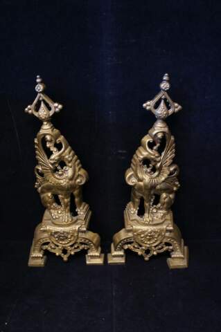 Gothic Revival Brass Andirons W/ Griffons Vtg Chenet Figural Griffins Fireplace
