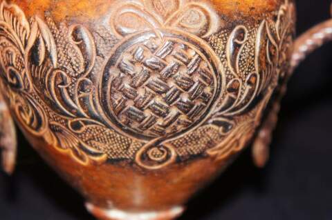 Vintage Metal Trophy Urn Rams Head Handle Floral Motifs Home Decor Pedestal Vase