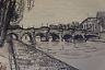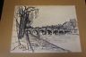 This is a gorgeous piece of fine art. It is a sketch of a river with a bridge going over it and examples of European architecture in the background. This piece was drawn on a piece of notebook paper using marker and pen. This piece is signed by artist(Lolay?, Volay?) and we believe to be of either French or Dutch origin. This is an absolutely beautiful piece and it would make a wonderful addition to your home or collection.