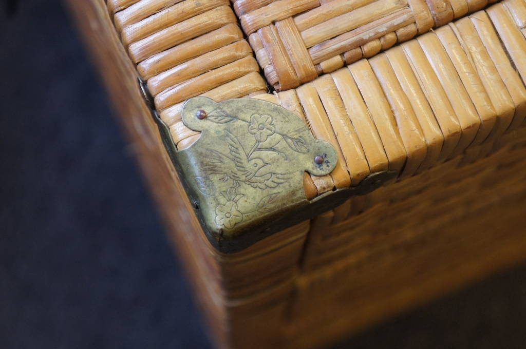 Vintage 3 Drawer Dresser Wicker Rattan Brass Accents Hardware Birds, removed 3-18-16