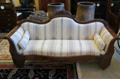 Antique Empire Sofa Camel Back Carved Walnut Burl Wood Settee Victorian 19th C.