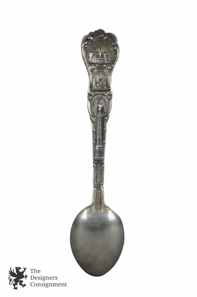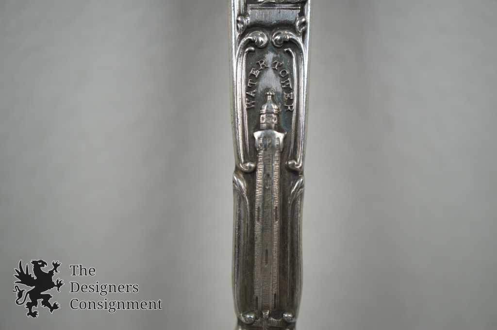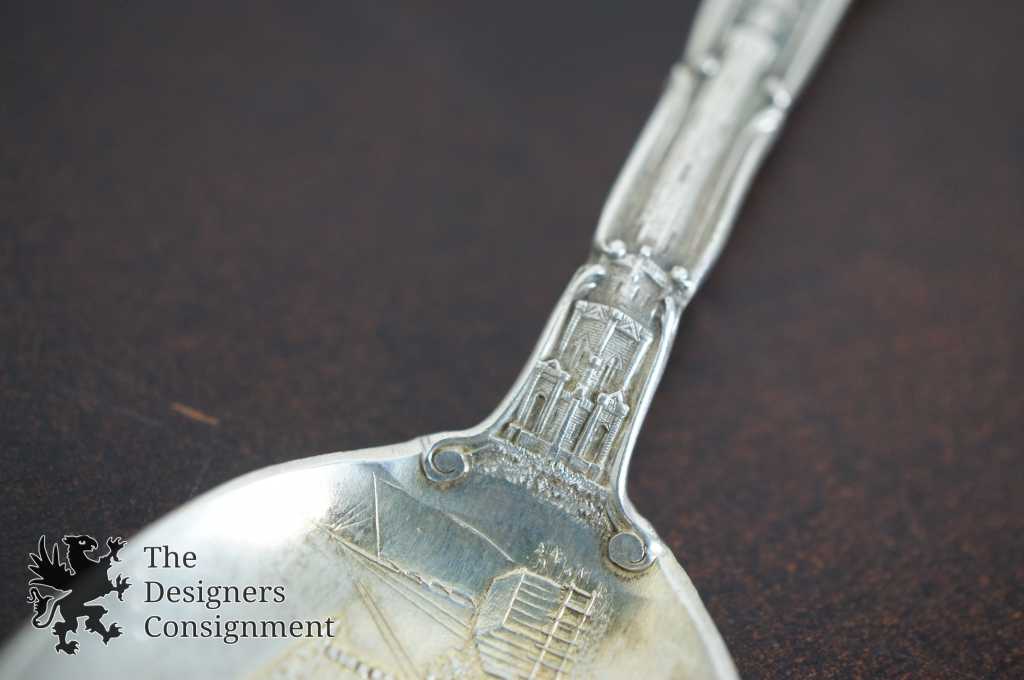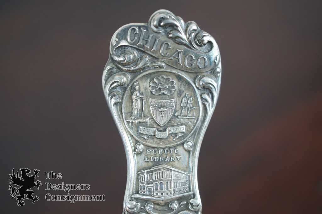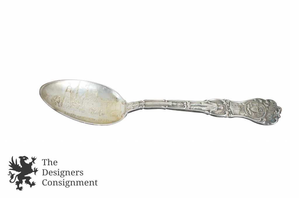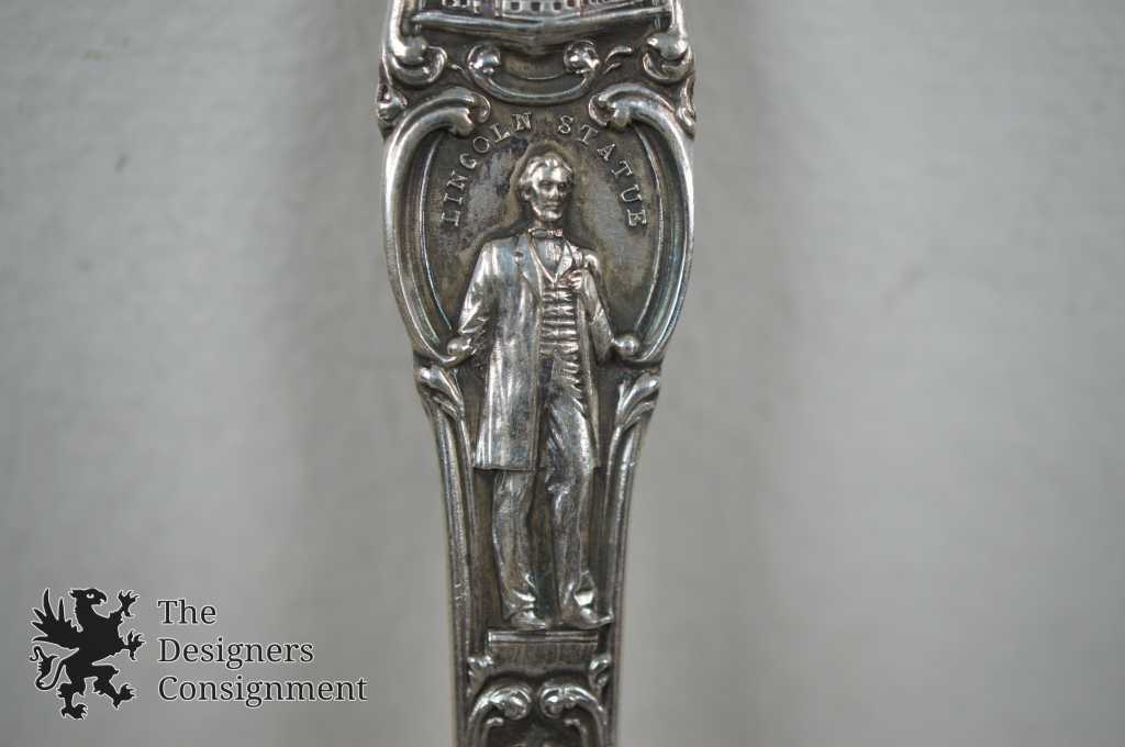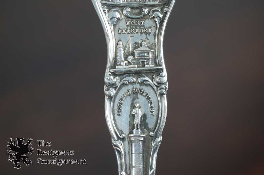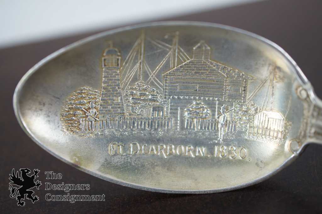 Here is a great piece of Chicago, Illinois and American history. This sterling silver spoon features Fort Dearborn as it looked in 1830, the water tower, the Lincoln Statue, the Public Library while the reverse side has Douglas Monument, Fort Dearborn and The Government building/Post Office. circa early 20th century.