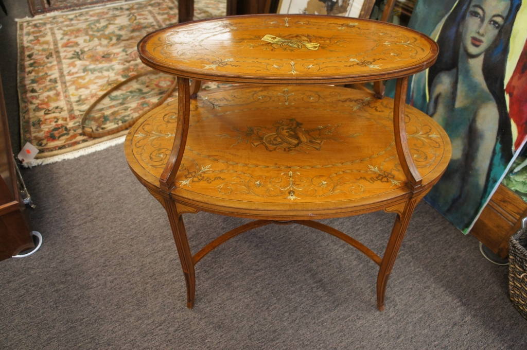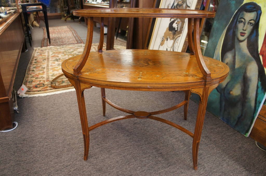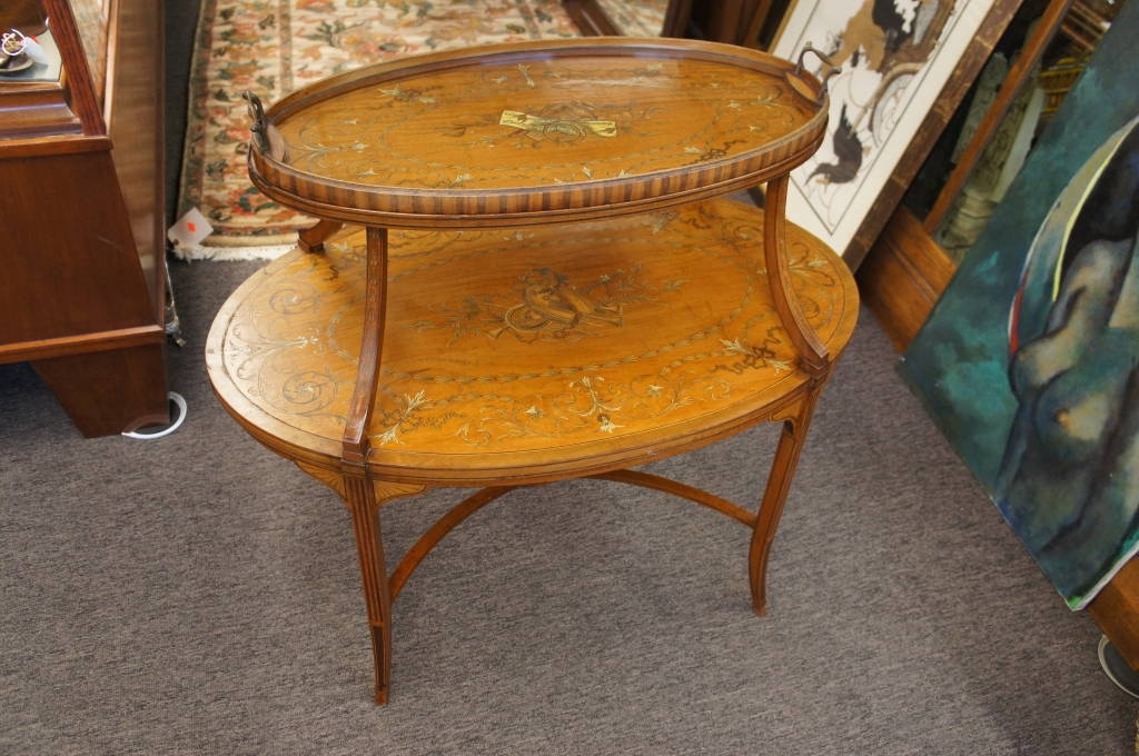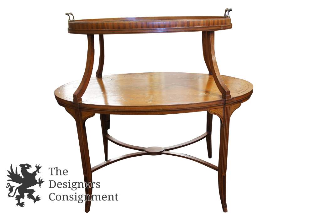 Here is a stunning piece of neoclassical furniture. Features intricate satin andfruit-woodmarquetry with a musical motif. The table itself is a butlers table with a glass top removable tray. Two Tier with a fabulous shape! Will look great in any home.