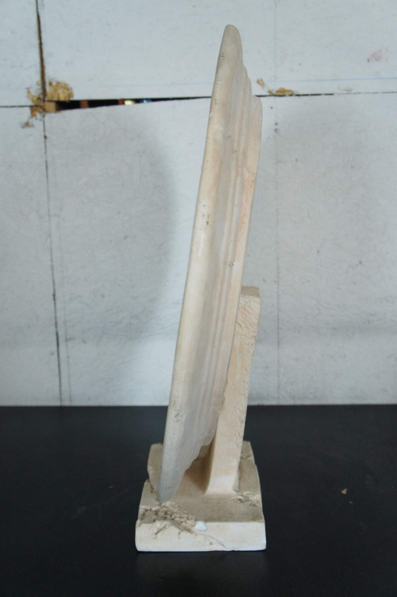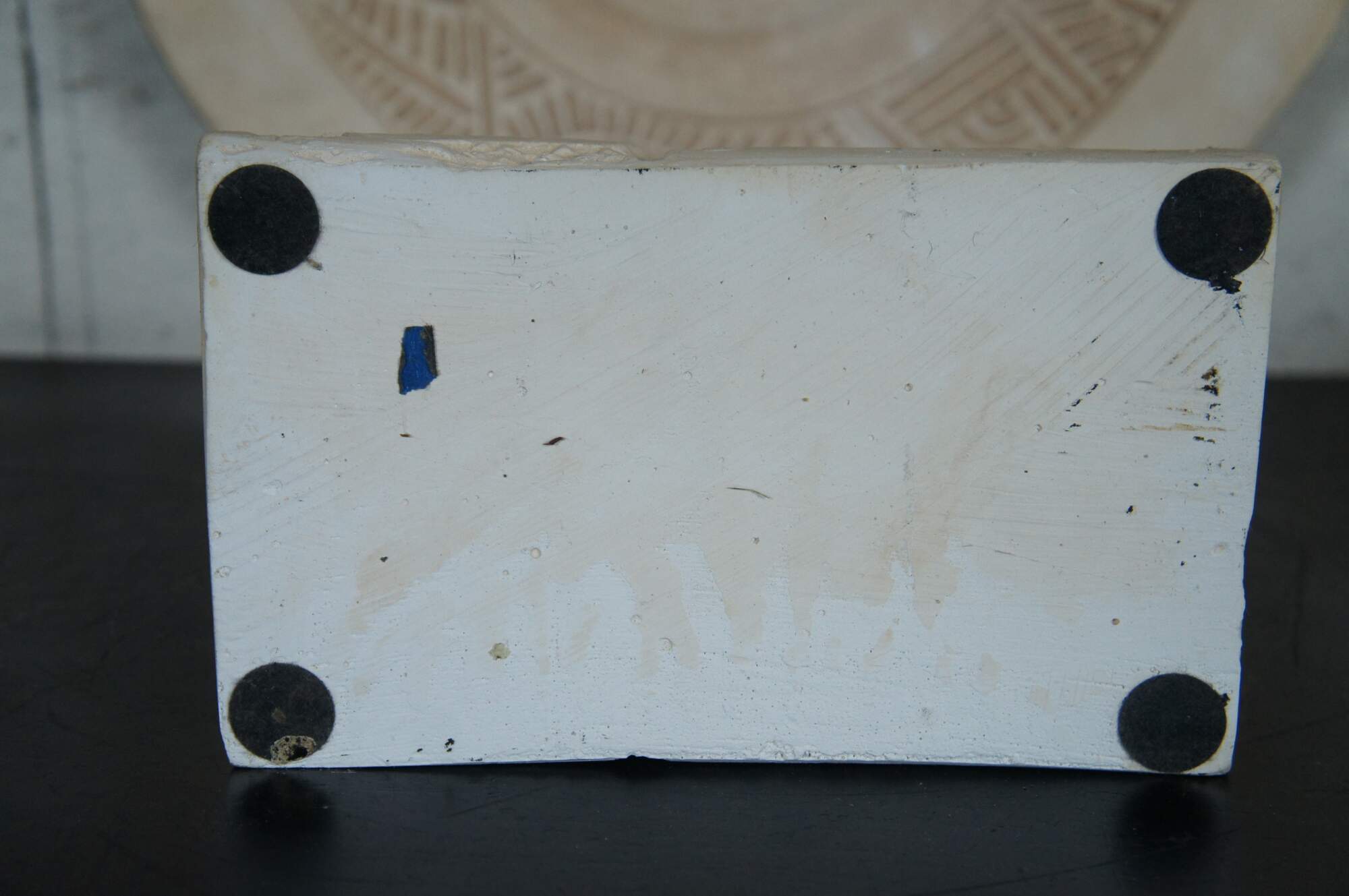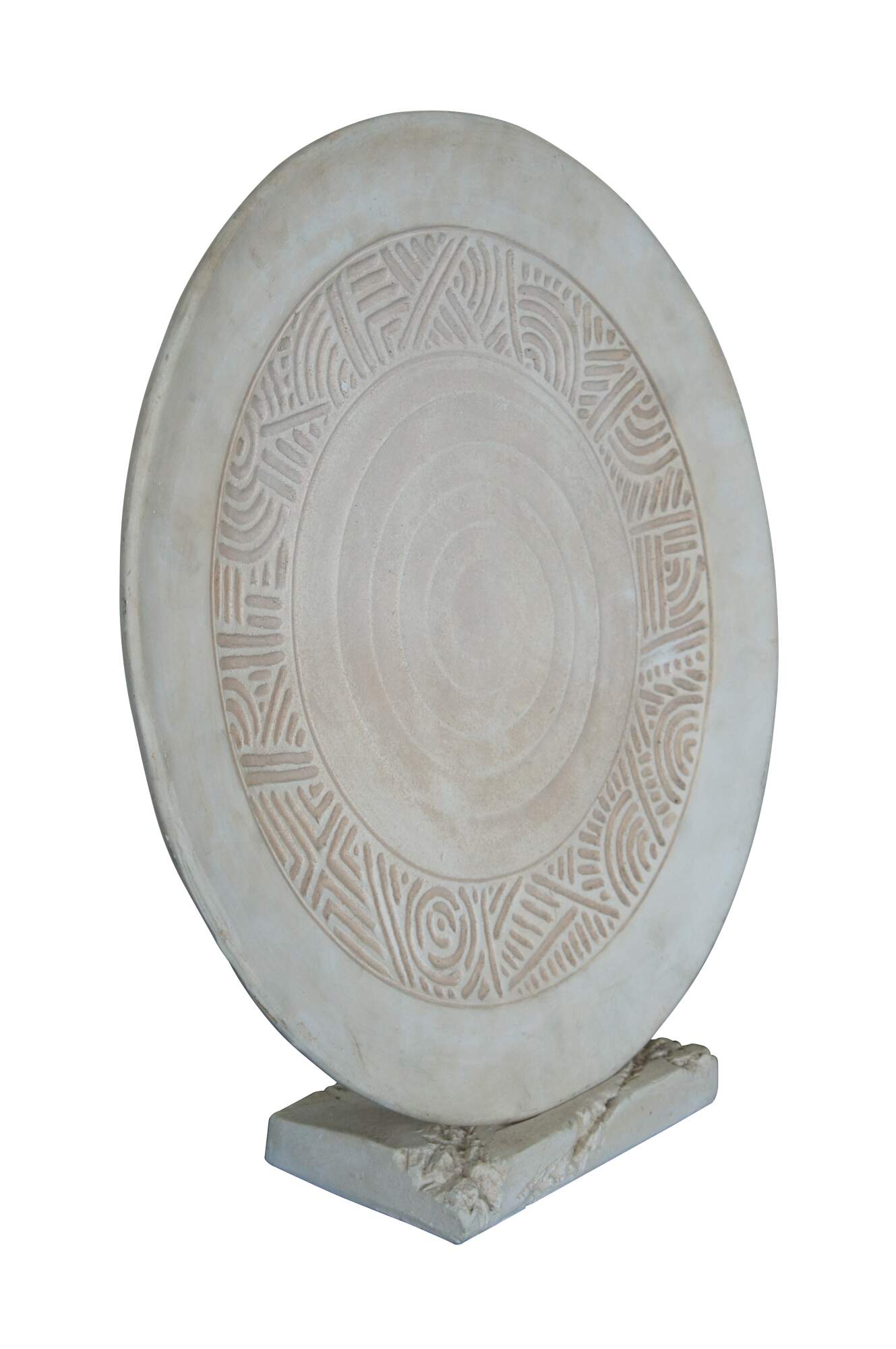 Vintage chalkware art sculpture display featuring a plate / charger / round disk with geometric patterns. Includes base / stand.