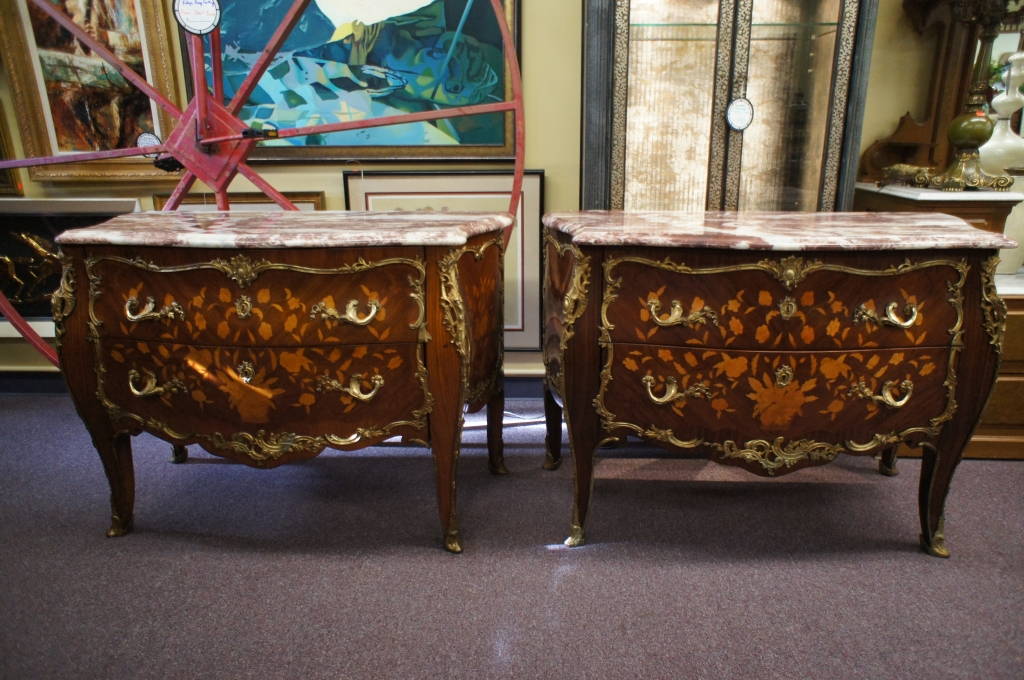 2 Louis XV Style Serpentine Commodes Fruitwood Marquetry & Gilt Bronze + Marble