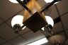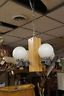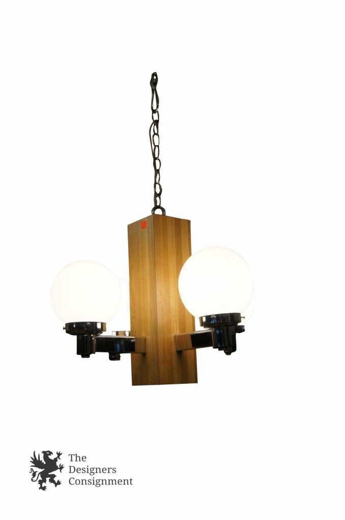 Here is a lovely mid century modern swag lamp. Features 4 opaque glass globes and one down light. The center is covered in an oak veneer. The light arms are chrome. Will look magnificent in any home or office