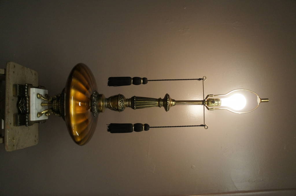 Stunning Hollywood Regency Brass Table Lamp Amber Glass & Marble Accent Light