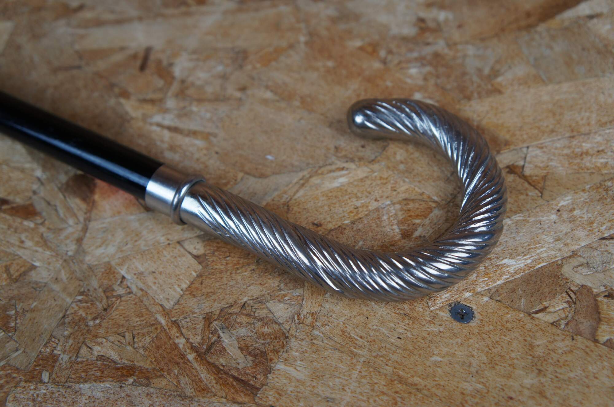 Vintage walking stick cane made of a plastic composit material with twisted silver plated handle.