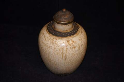 John Richards Collectible Designer Lidded Urn Vase Display Ceramic Brass Accents