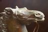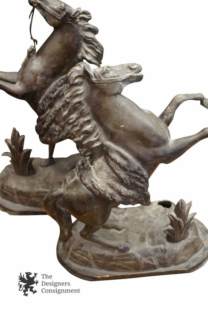 A stunning pair of spelter bronze figurines or bookends. Each features a young boy struggling with their horse. Beautifully detailed with amazing attention to detail.