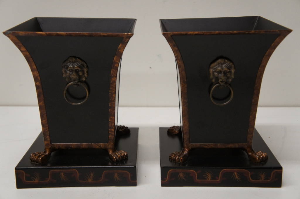 2 Stunning Toleware Hand Painted Jardiniere Flower Planters Lion Knockers 8