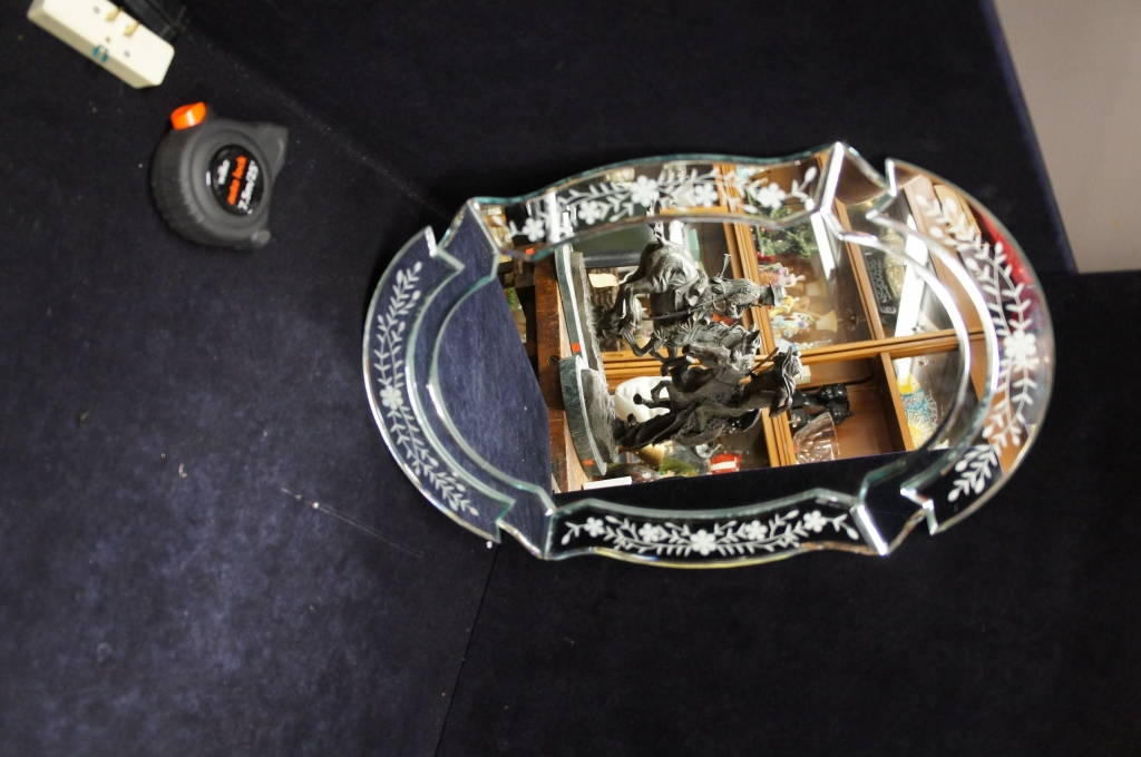 Lg. Oval Venetian Footed Mirror Trivet Etched Engraved Glass Vanity Tray Plateau