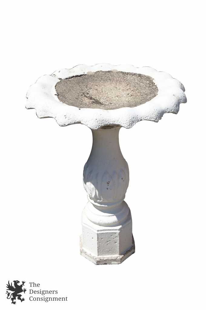 2 piece concrete bird bath. Features a baluster shaped base and flowered bowl. A neat addition to any garden.