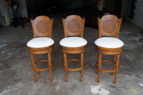 3 Stunning Traditional Bar Height Swiveling Stools Fluted Legs Rattan Back