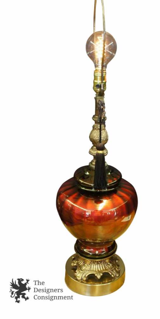 A fun metallic red lamp. Features brass accents and tassels. Will look fantastic in any home