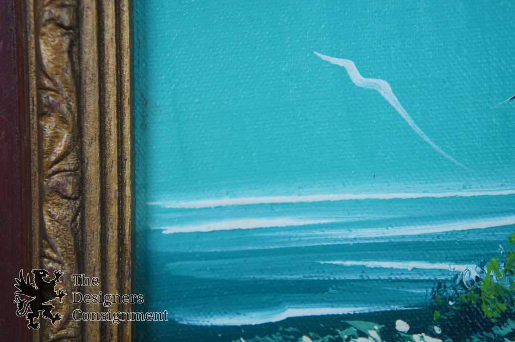 A beautiful oceanscape. Features a seagull flying towards the ocean with light breaking through the clouds. A great piece that will bring warmth to your home for years to come