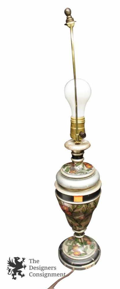 A fun arts + crafts lamp. Made from wood with a hand painted exterior.