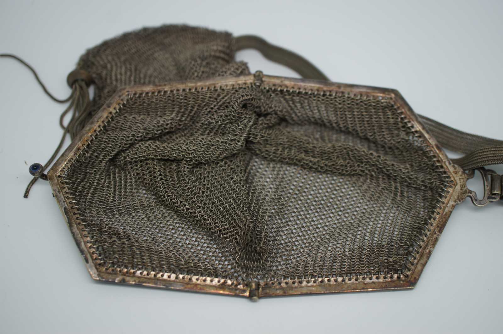 Victorian / Edwardian era chainmail mesh purse. Features classic styling, stamped L.S. Soldered Link on clasp.