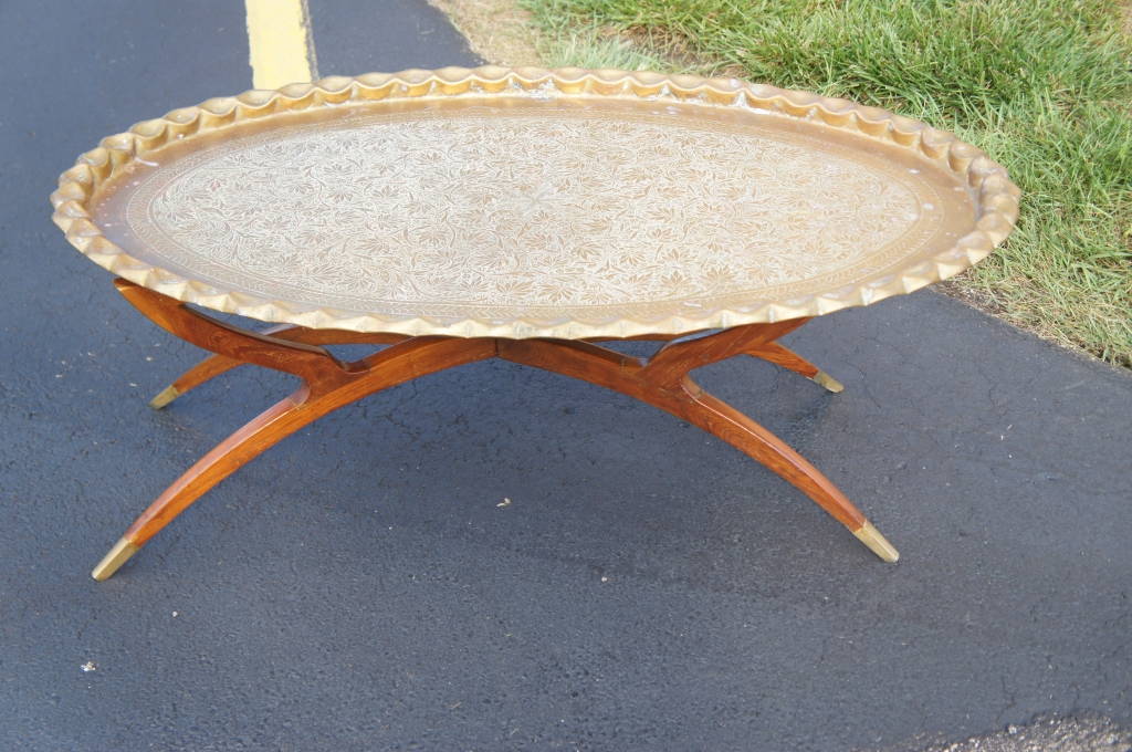 Vintage Middle Eastern Embossed Brass Coffee Table Folding Tray Maple Morrocan