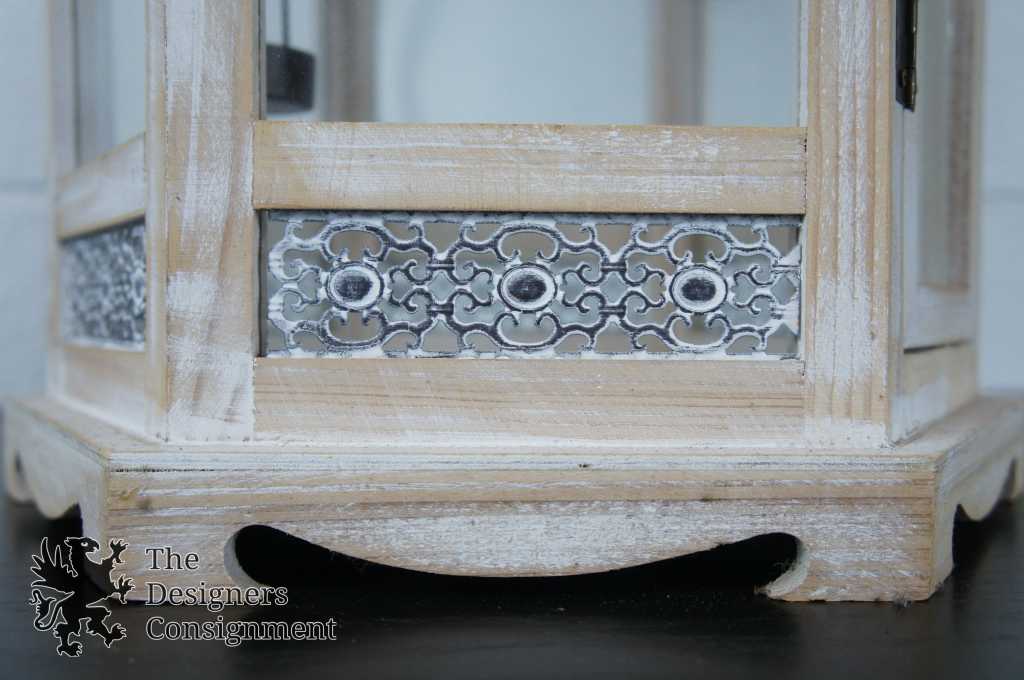 Monumental Moroccan Votive Lantern. Made from whitewashed wood with a pierced metal dome and lattice inserts. Interior features 4 staggered hanging positions for tea lights. A neat compliment to any setting.