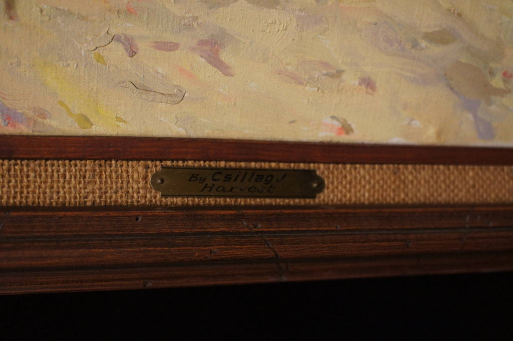 A beautiful original oil by Yozsef Csillag (1894 - 1977) a Hungarian artist known for his landscapes. This piece is titled Harvest, and features workers in the field on a cloudy day. The attention to detail is absolutely stunning. Framed in a distressed Mahogany with a name plate and title on the matte. A fine addition to any collection!