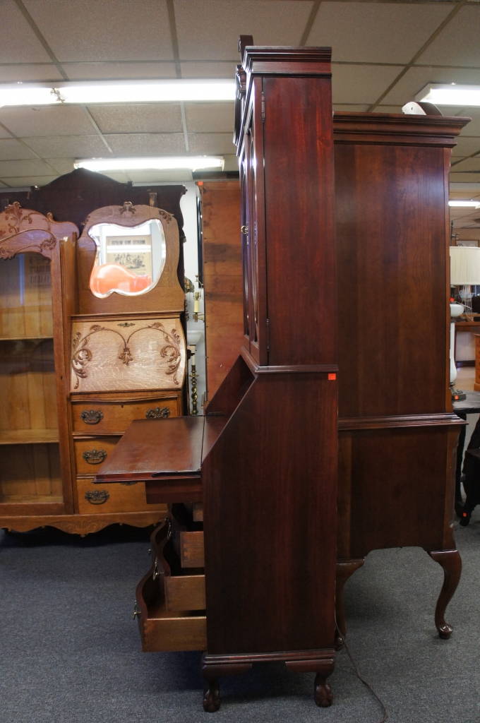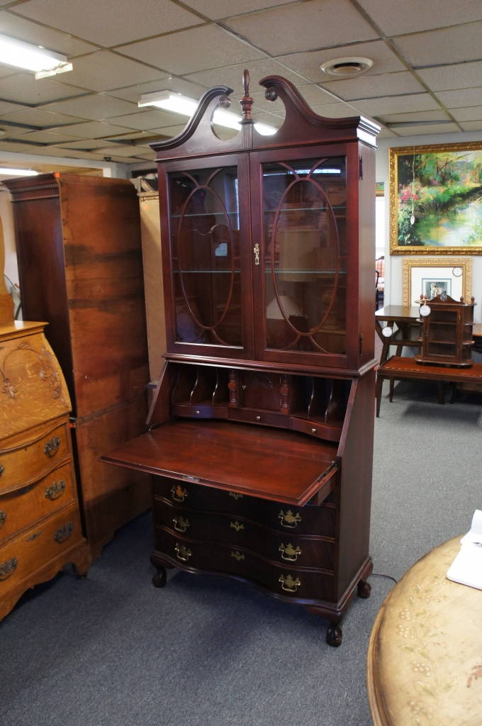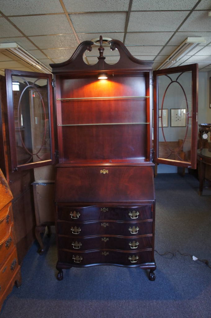 Vtg Georgian Style Flamed Mahogany Oxbow Secretary Desk & Bookcase Jasper Cab Co