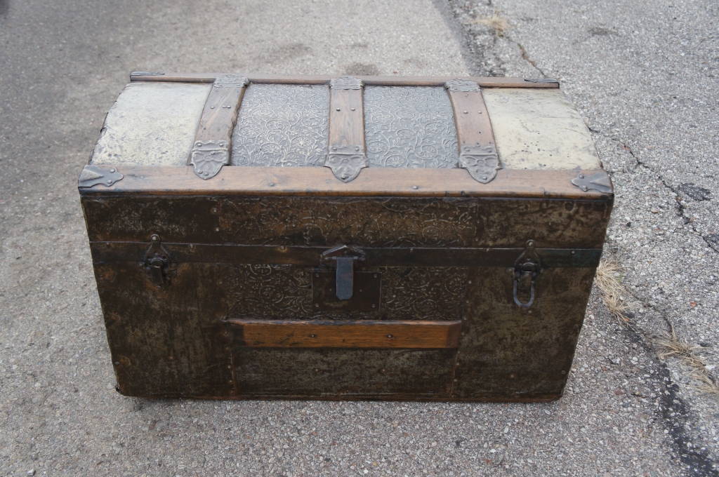 Primitive Antique Steam Trunk W/ Embossed Metal Blanket Chest Pirate Ships