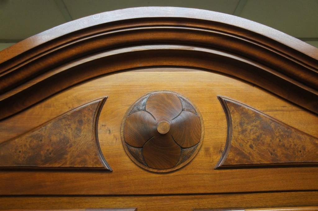 A magnificent piece of Eastlake Furniture that will addgrandeurto any room.Made from walnut burlwood with carved accents. You will notice that there are only a few photos with the finial on top as it is larger then our ceiling space and difficult to see. Inside is plenty of room for storage. There are 4 large removable porcelain casters. In addition there are 4 keys for each of the four locks. One of the keys does not work and in place for looks.