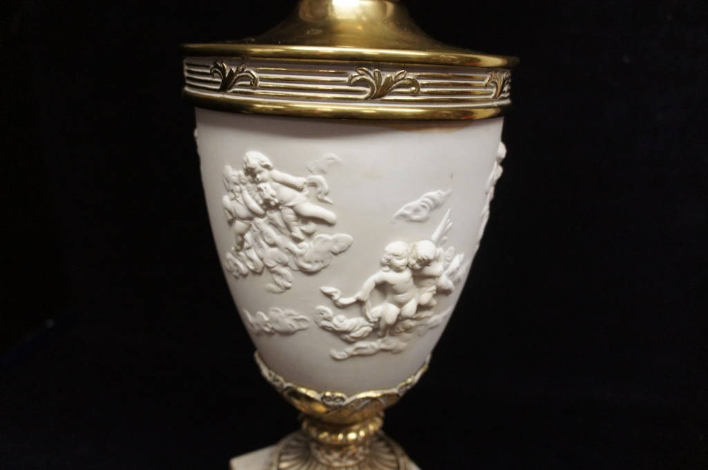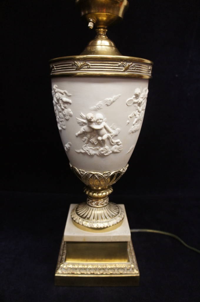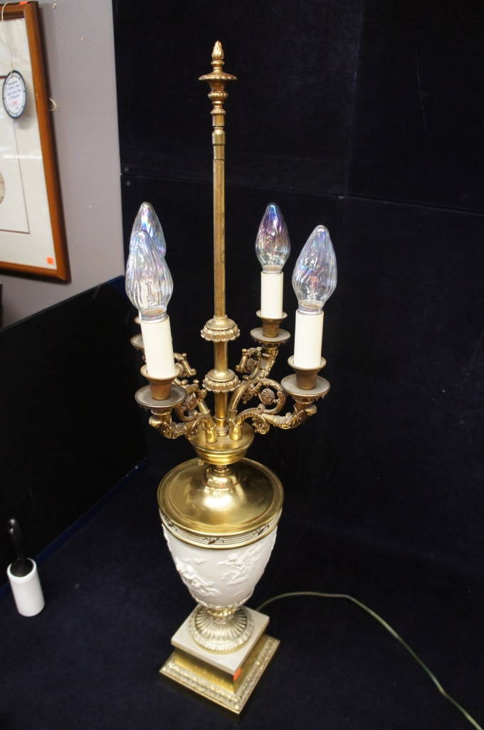 Early 20th Century High Relief Bisque & Brass Candelabra Table Lamp Cherubs 37