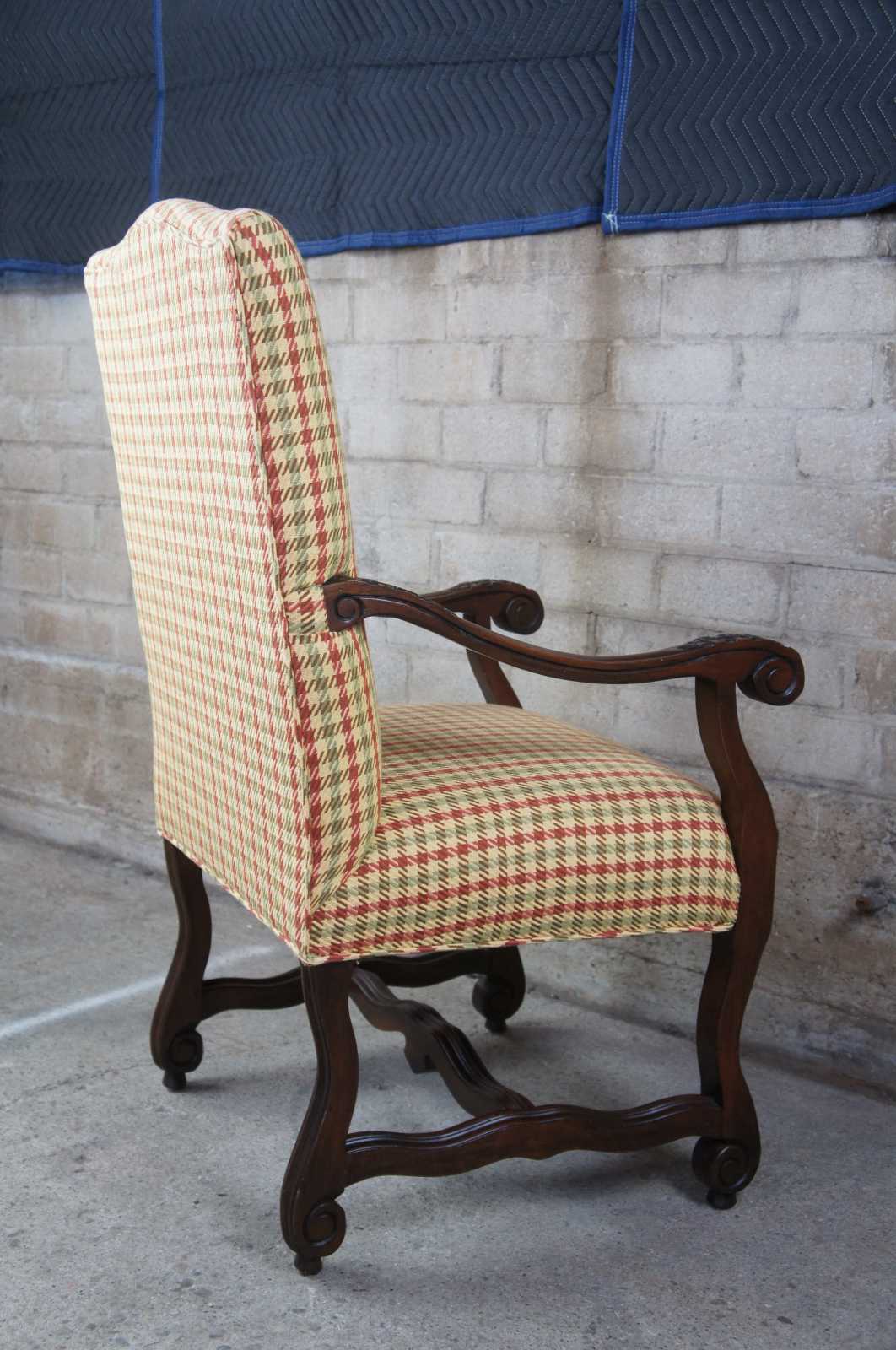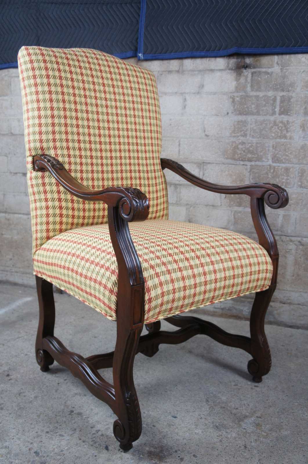 Old world Tuscan style arm chair with scrolled arms and legs. Features acanthus leaf carvings and a serpentine trestle base. Great for use in the library or living area.